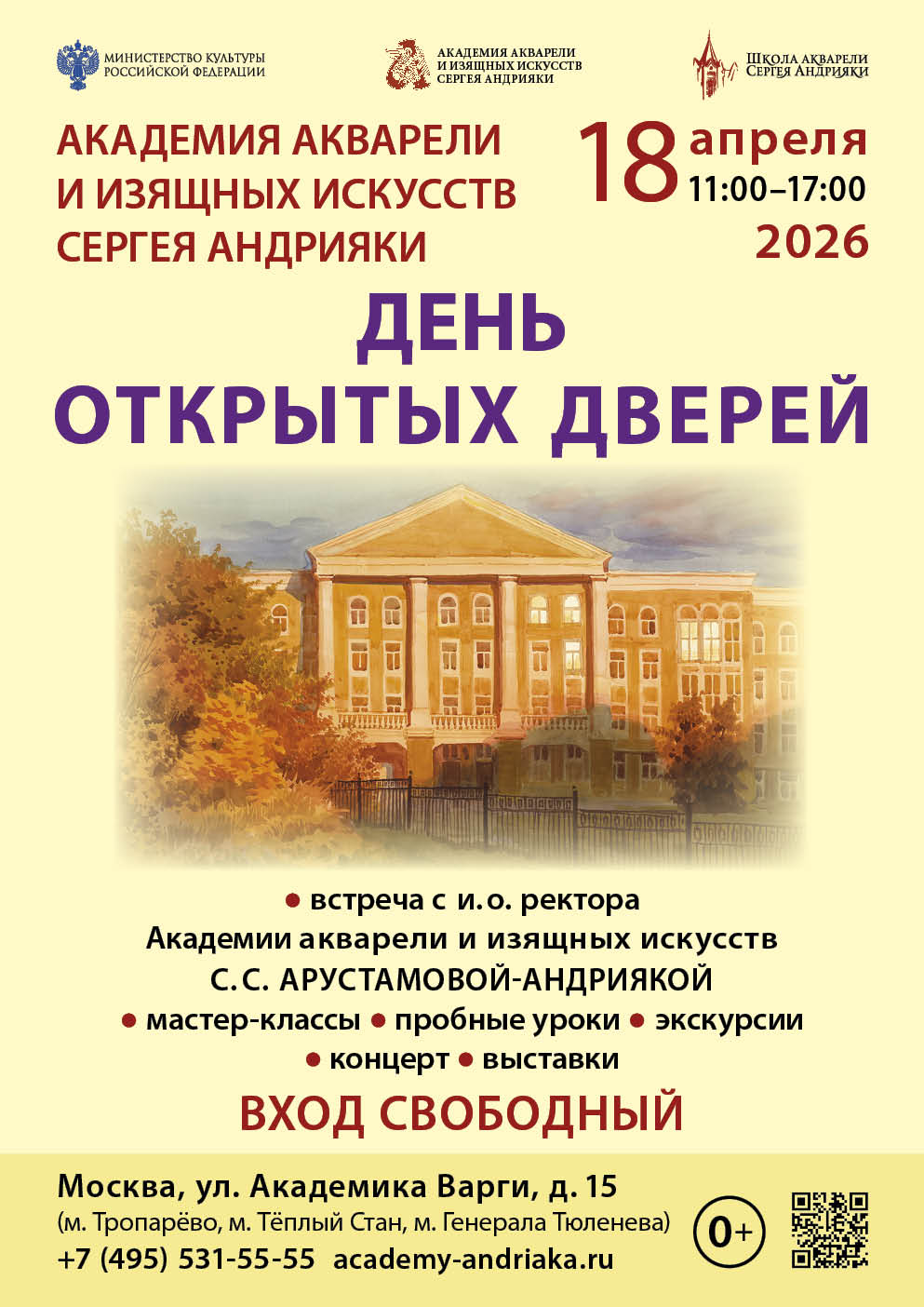18 апреля 2026 г. с 11.00 до 17.00 в Академии акварели и изящных искусств Сергея Андрияки пройдет День открытых дверей!
