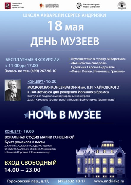 18 апреля 2026 г. с 11.00 до 17.00 в Академии акварели и изящных искусств Сергея Андрияки пройдет День открытых дверей! В программе мероприятия: Встреча гостей с и.о. ректора Арустамовой-Андриякой Софьей Сергеевной; мастер-классы; пробные уроки; экскурсии; выставки; концерт; выставки.