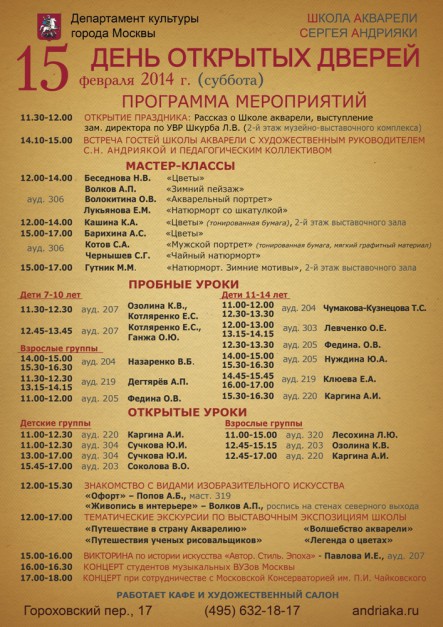 18 апреля 2026 г. с 11.00 до 17.00 в Академии акварели и изящных искусств Сергея Андрияки пройдет День открытых дверей! В программе мероприятия: Встреча гостей с и.о. ректора Арустамовой-Андриякой Софьей Сергеевной; мастер-классы; пробные уроки; экскурсии; выставки; концерт; выставки.