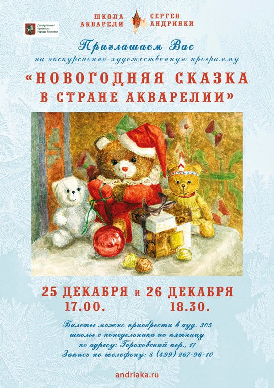 Приближаются самые любимые зимние праздники Новый год и Рождество, которые погружают нас в мир чудес. В преддверии новогодних праздников Школа акварели Сергея Андрияки приглашает Вас на экскурсионно-художественную программу «Новогодняя сказка в стране Акварелии». Во время программы Вы посетите выставку работ Народного художника РФ Сергея Андрияки, где представлена тема зимних праздников в акварельной живописи. Экскурсовод расскажет о традициях и обычаях празднования Нового года и Рождества в прошлом и настоящем.
