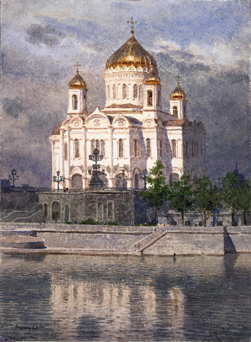«Мне кажется, что очень украсил Москву восстановленный Храм Христа Спасителя. Он является своеобразной доминантой города и гармонично дополняет его современный образ. Я написал его под грозовым небом, а потом делал эскизы с разных точек, откуда он был виден и зимний, и летний».